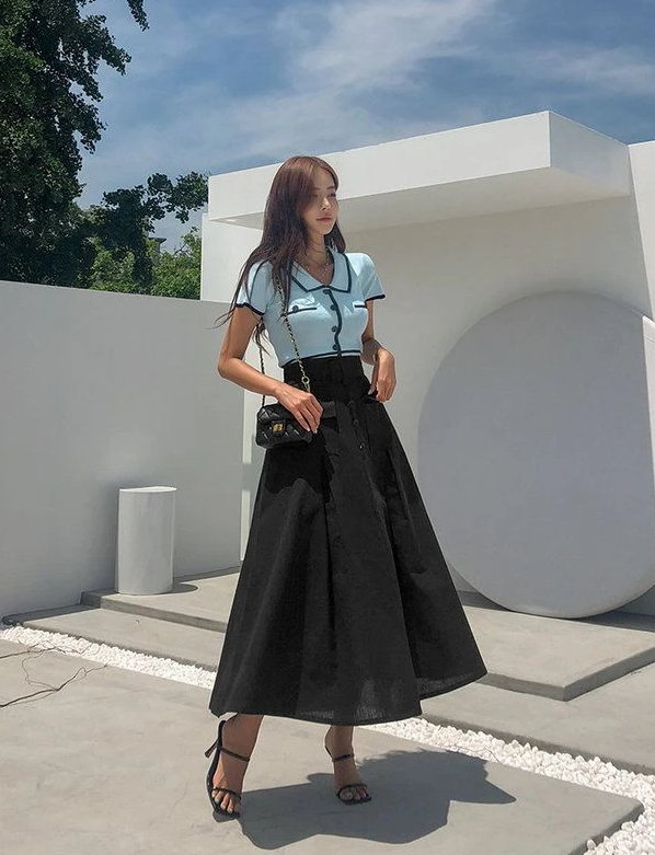 스카이블루 배색 반팔 니트