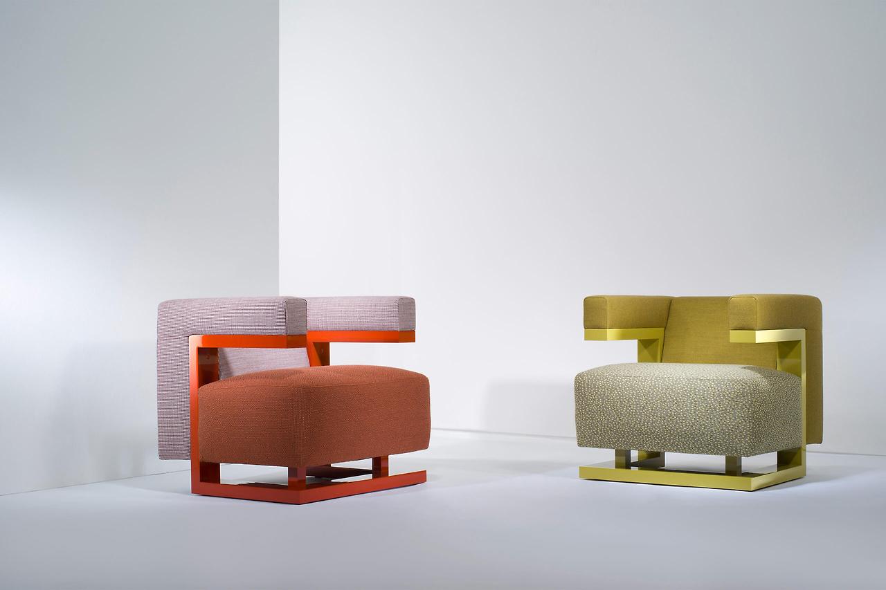 대표 가구: F51 암체어 – 날카로운 직선과 비대칭 구조가 특징인 현대적 라운지 체어