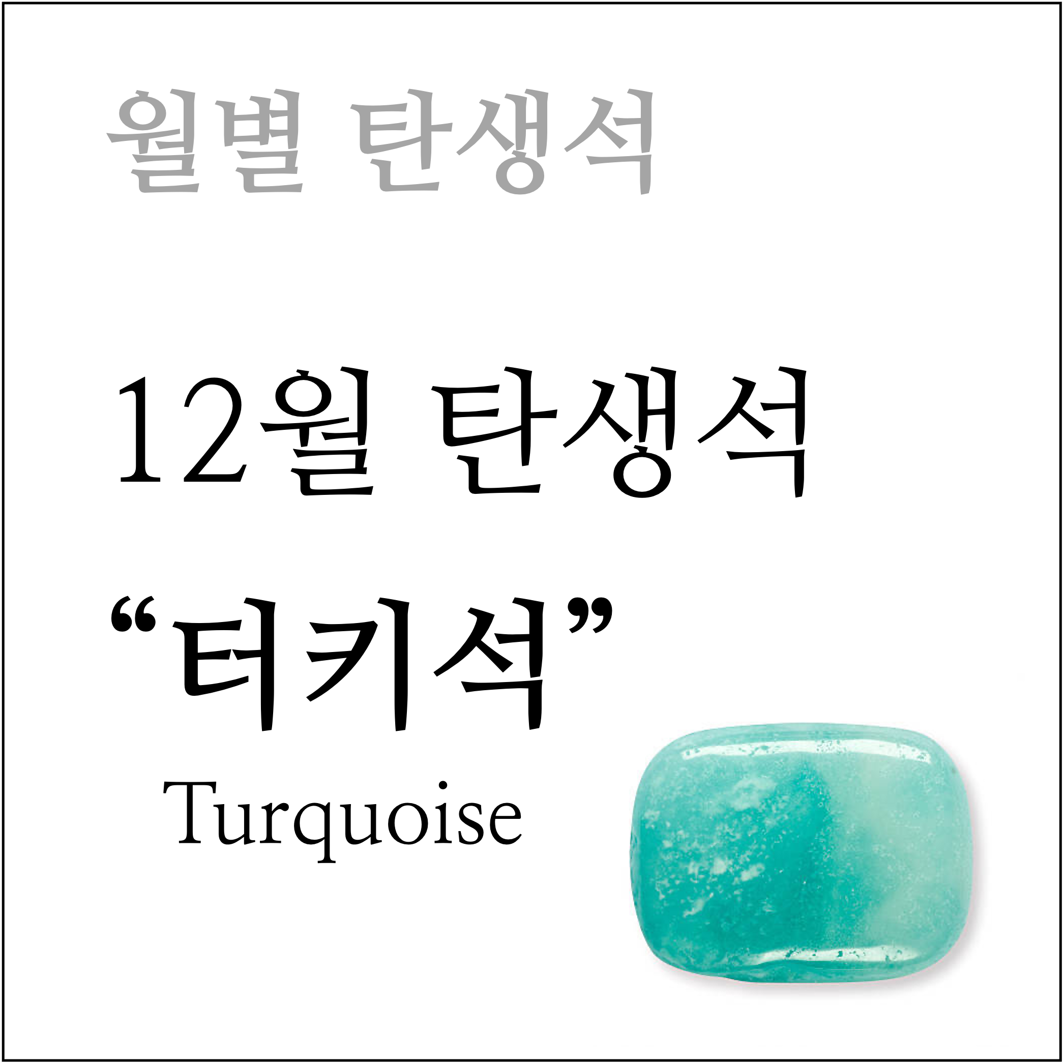 12월의 탄생석은 터키석(turquoise)입니다. 불투명한 청록색 광물로 나타나며, 수화된 인산 구리와 알루미늄으로 구성되어 있습니다. 터키석은 수천 년 동안 장식용 보석으로 귀하게 여겨졌습니다.