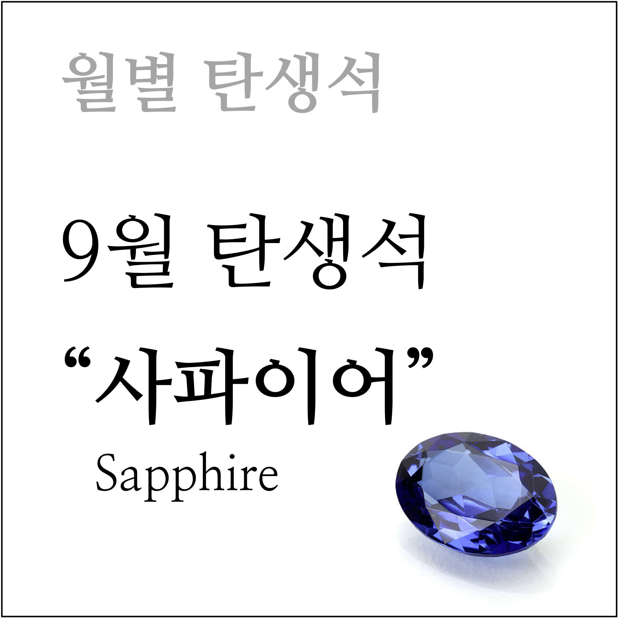 9월의 탄생석은 사파이어(sapphire)입니다. 사파이어는 커런덤(corundum) 보석류에 속합니다. 푸른색으로 유명하지만 사실 사파이어는 빨간색을 제외한 모든 스펙트럼의 색을 나타낼 수 있습니다. 빨간 사파이어는 다른 보석으로 분류되어 '루비'라고 불립니다.